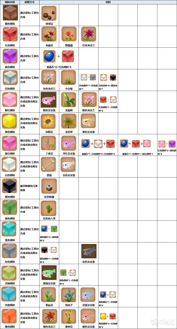 诸位探险家们,小北搜集的各颜料的相匹配表都储存好了没?拥有这个表格,你就能拥有更多彩色方块了,快使用更多的彩色方块去装饰设计你工程建筑吧!