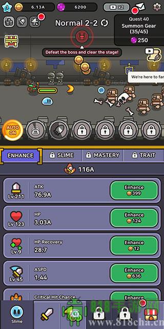 3、操作起来非常简单,仅需等待拥有足够的金钱并升级属性即可。 史莱姆传说怎么玩1、下载并打开游戏,完成基础教程关卡后就可以对基础操作熟练掌握了,之后来到下方界面