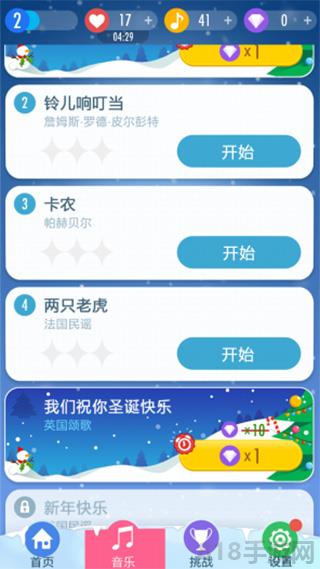 ①选择一首歌曲开始,界面会出现四个赛道,每个赛道会随歌曲的乐谱出现黑色的钢琴键,从上向下移动,点击钢琴键就会发出音符的声音,连续点击成功,音乐就会流畅的播放出来。