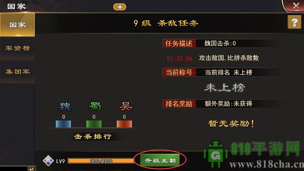 国家等级达到要求时在“国家升级”按钮处出现“建立王朝”按钮,点击升级王朝即可开启升级任务。