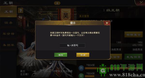 注:升级王朝时间为每日8:00~24:00,其余时间不能发起升级。