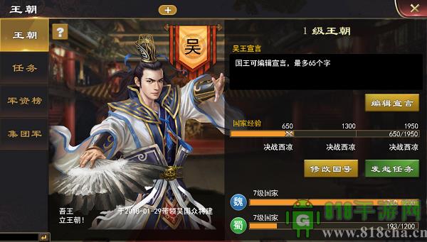 东汉乱世,魏、蜀、吴三分天下傲视群雄,王朝建立后各国身为国王的主公可建立属于自己国家的“国号”并设立本国宣言!