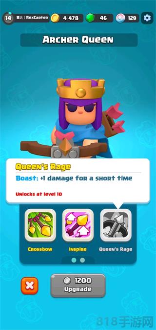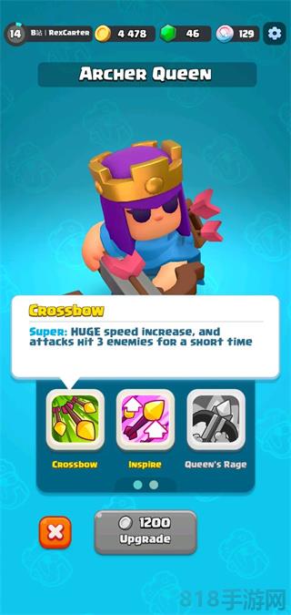 她的1级的技能名为为“crossbow”。在能量条满了之后,女皇将会自身开启狂暴,提升攻速并且在短时间内每发普攻都会命中三位敌人。
