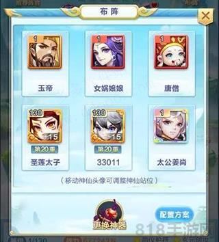 2、九五级子牙、太子、玉帝、红唐僧、红女娲、主角变红唐僧。☆貔貅、0☆火龙、0☆宝莲灯、0☆紫金元神,元始天书。站位如下图所示。