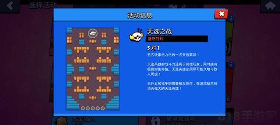 天选之战:是荒野乱斗中唯一的非平衡玩家对抗模式:玩家会随机成为天选之子或者普通英雄,天选之子有更强的战斗力和极高的生命值,面对五位英雄的围攻,只要在两分钟内没有被打倒即可获得游戏胜利,而其他五个猎手则需要相互协作,在两分钟之内消灭天选英雄才可获得胜利。