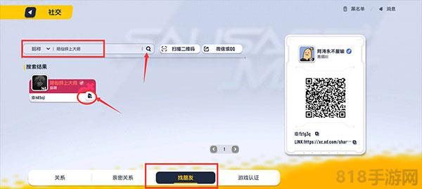2、进入社交后在底栏选择找朋友,然后在搜索框输入id或者昵称点击搜索即可找到好友然后点击名片右小角的按钮进行添加