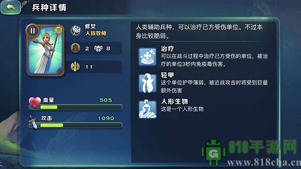 1、人族是剑与家园目前版本中唯一有加血部队的种族:牧师。打开我们的大教堂查看牧师兵种的特性。