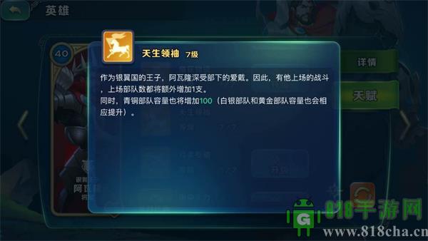 阿瓦隆,自带光环的骑士,能增加弓手的攻击力,“集中火力”打BOSS必备,最重要的是 “天生领袖”这个天赋,对于新手来说,这个天赋非常重要,能提高你上场部队的数量,以及提高你青铜部队、白银部队、黄金部队的容量,正所谓千金难买一人口,这个天赋一定要点,还有“缴纳物资”这个天赋,能在战斗后额外获取资源,在前期战力和体力有限的情况下,也是不错的选择,阿瓦隆看似辅助型英雄,但前中后期都有不同方向的高收益;