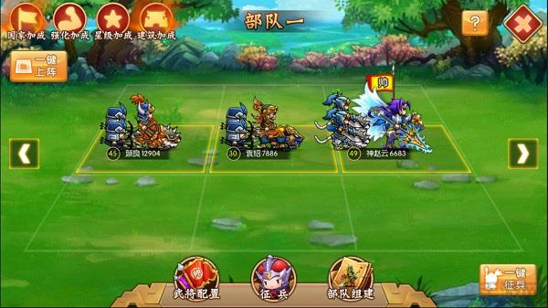 在三国大领主中推荐排兵布阵:前锋神赵云+中军袁绍+后军颜良
