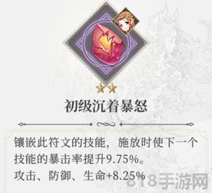 1、沉着暴怒符文:初级是紫色品质,中级是橙色,但效果一样,都是提升下一个技能的暴击几率。符文的重点效果还是在能够为后一个技能增加比较高的暴击率。那么以勇士队的核心输出精灵公主葛莱蒂丝(自动技能释放顺序为3-2-1-1-1-奥义)为例,其本身就是一个享受勇士阵容暴击伤害暴击率加成的角色,那么我们将这个符文镶嵌在1技能上,不但能享受多次1技能加暴击的效果,自动战斗时大招也仍然能够享受加成。