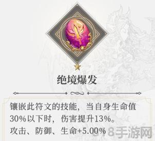 4、绝境爆发符文:橙色符文,这个一看就知道是专为狂战队设计的符文,其他阵容都难以在低血量打出奇效。所以应用起来也以狂战角色镶嵌为主。