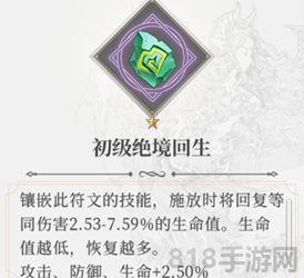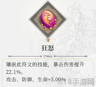 5、绝境回生符文:初级为紫色,中级为橙色。生命值越低,恢复越多。这个符文放在任何伤害阵容都能增加生存概率,狂战的特性和这个符文也非常的契合,很适合PVP时使用。