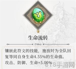 4、生命流转符文:橙色符文,作用是镶嵌此符文的技能,施放时为全队回复等同伤害XX%的生命值。这个符文目前也没有什么特别合适的使用场景,还有待进一步开发,新手同样先跳过不考虑。