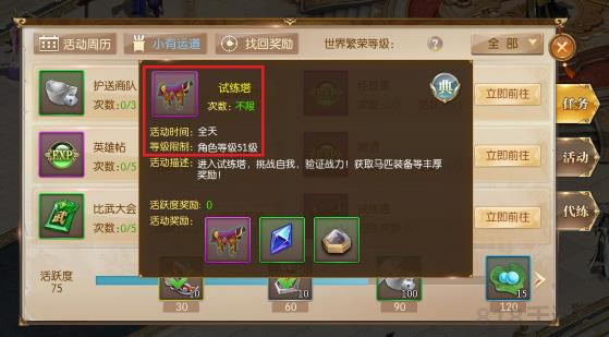 1、等级到51级后,开启试练塔任务。
