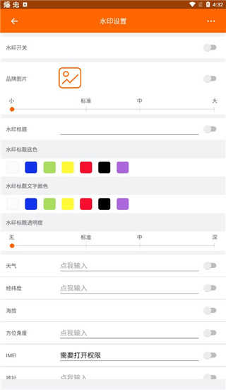 2、在“水印设置”中设置水印开关、天气、地点、经纬度、工程名称等等。