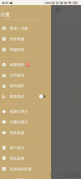 2、点击左上角的符号能够打来设置功能,其中有着登入注册、同步数据、卓面插件、日历查询、密码保护、黑夜模式等工具: