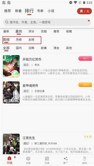 2、在排行菜单下,可以看到各种榜单,月榜、周榜和总榜等;