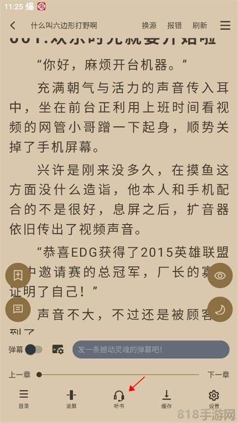 1、进入到小说阅读界面,轻点屏幕唤起菜单,点击下方的听书选项。