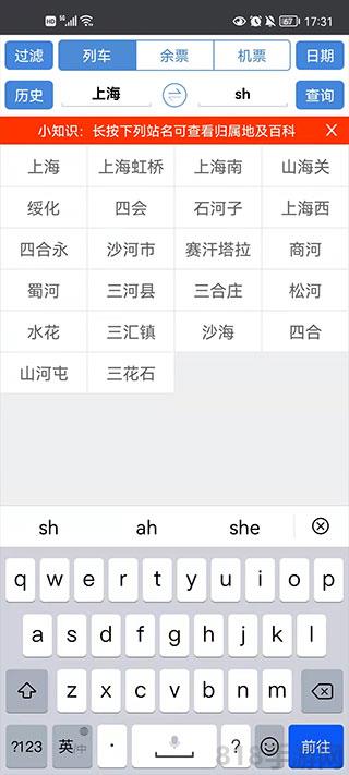 2、站名输入可用站名拼音首字母,如上海(SH),杭州东(HZD)。