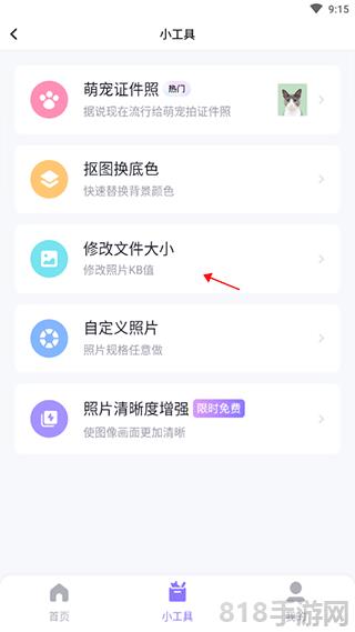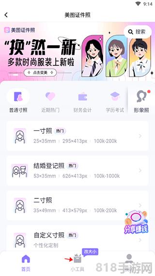在证书照片界面中,找到下面的“小工具”选项,点击进入