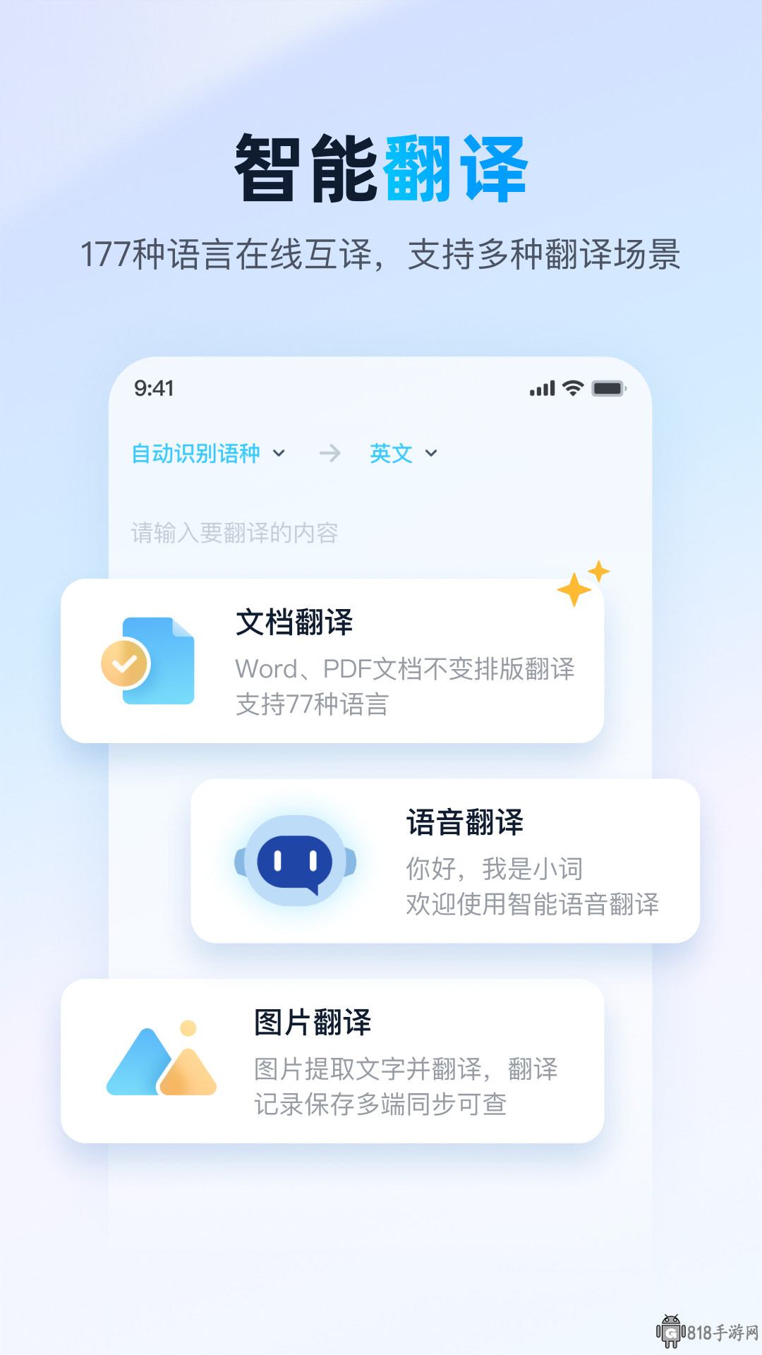 支持拍照翻译、图片翻译、取词翻译、语音翻译、语音录入翻译,中文日语英语法语西班牙语多语言翻译。