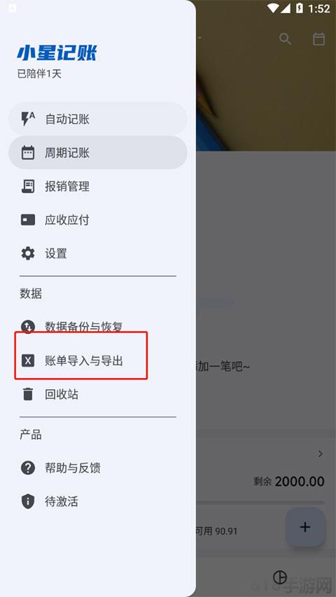 1、同样的,点击左上角的设置功能选项,然后选择“账单导入与导出”功能。