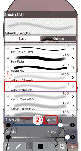 需要把颜色换成白色, 然后选择喷枪画笔,有点像三角形的画笔,选择70像素的厚度设置。