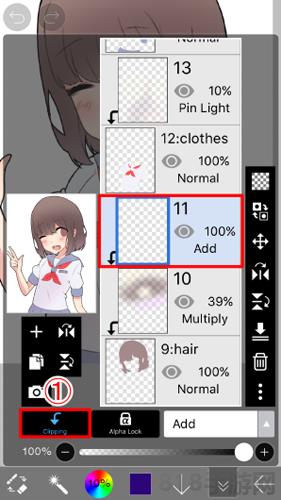 同样, 点击加号按钮在 "图层" 窗口中, 为阴影添加图层, 使其成为当前图层, 并将③混合模式 "乘法"并最终转到步骤四剪切on。另外, 将画笔颜色更改为黑色。