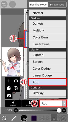 点击图层1使添加的图层成为当前图层。然后点击"添加"以打开步骤2的混合模式菜单。最后选择步骤3在 "混合" 菜单中添加。