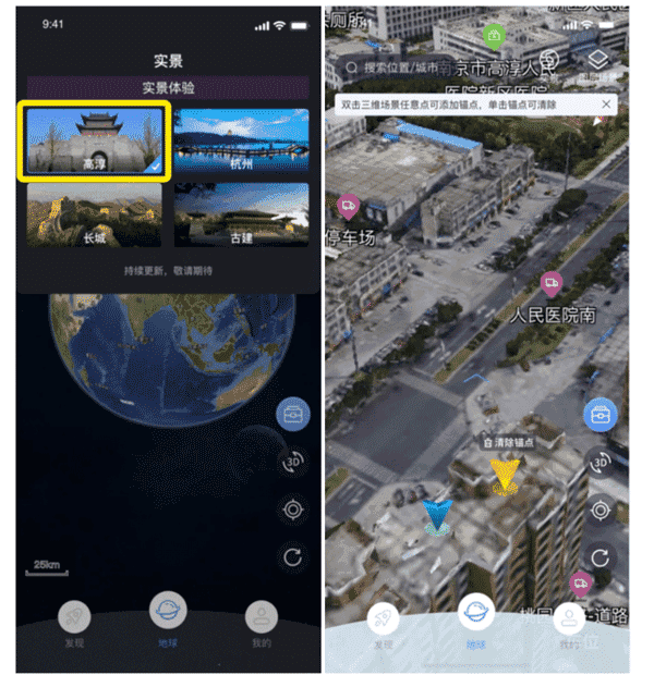 1、首页地球点击右上角【实景】按钮,出现实景选择页面;